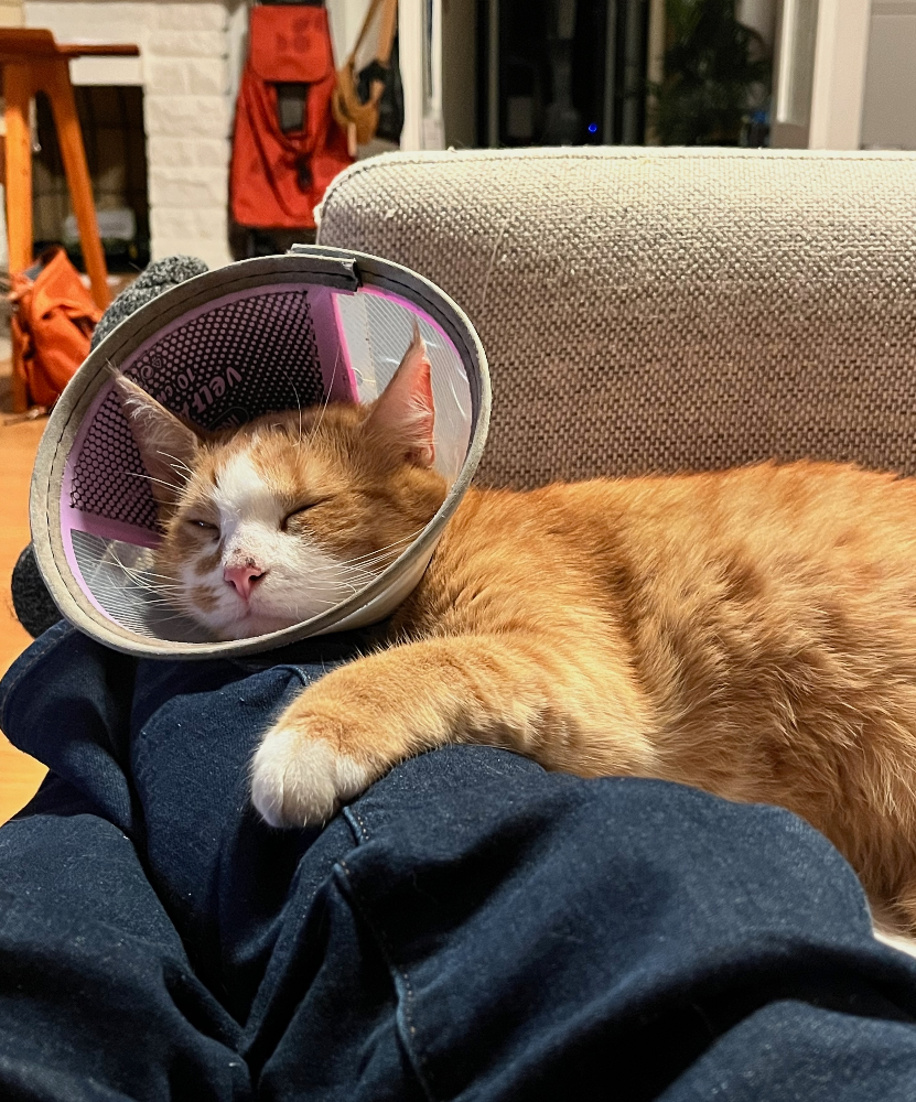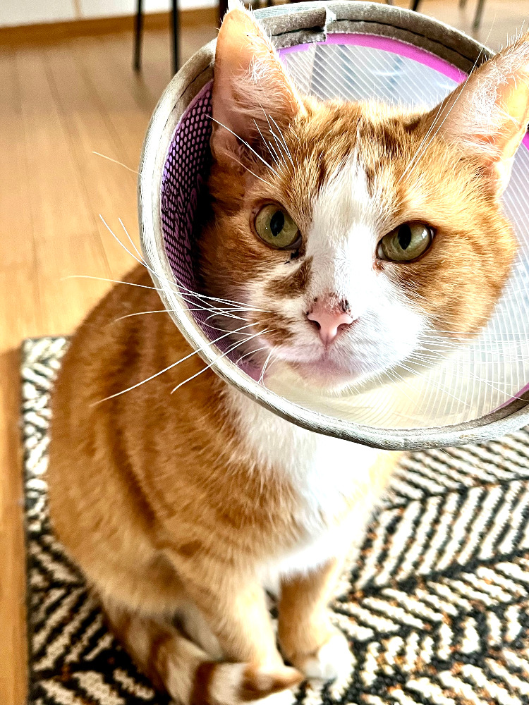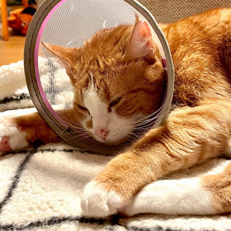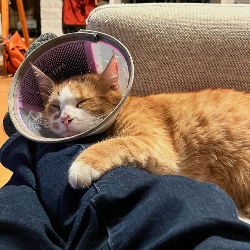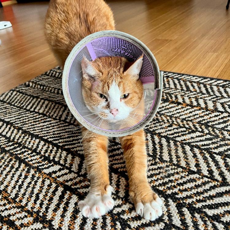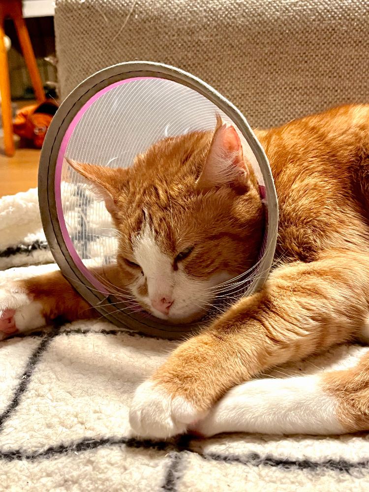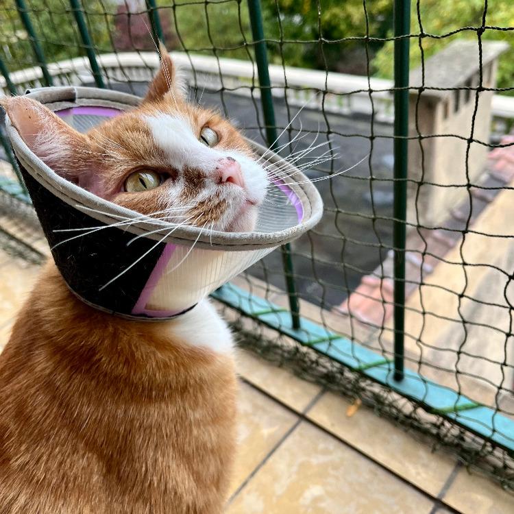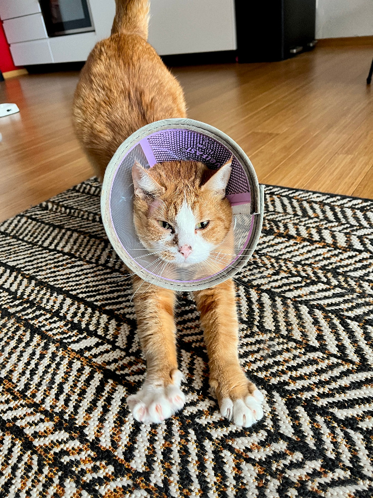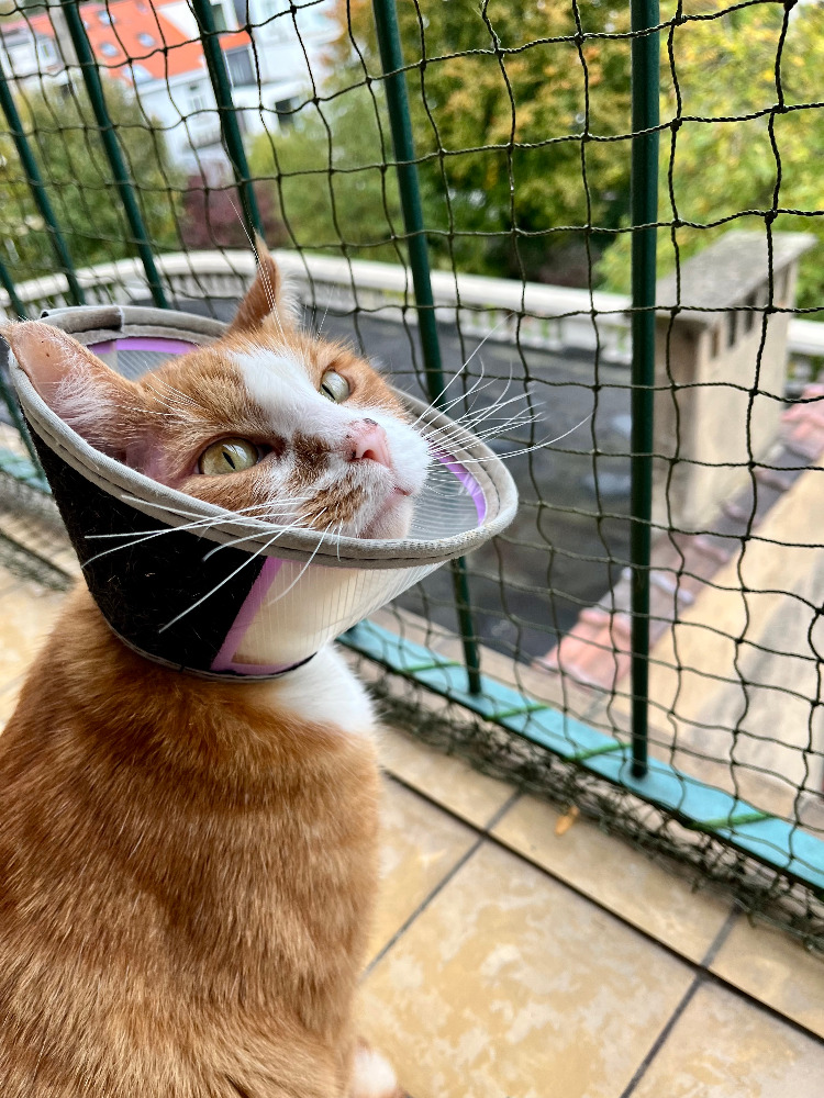 Actuellement, je vis dans ma famille d’accueil avec d’autres chats. On vit en bonne entente, mais je reste tout de même plus en recul, on pourrait dire que je suis un contemplatif. Je redécouvre, à mon rythme, ce que signifie la liberté, la légèreté et le jeu. Ma collerette me limite évidemment un peu dans mes mouvements, mais je recommence déjà à jouer avec des balles et petites souris en peluche ! Mon avenir s’éclaire enfin, le meilleur est à venir pour moi.. et avec vous, je l’espère !